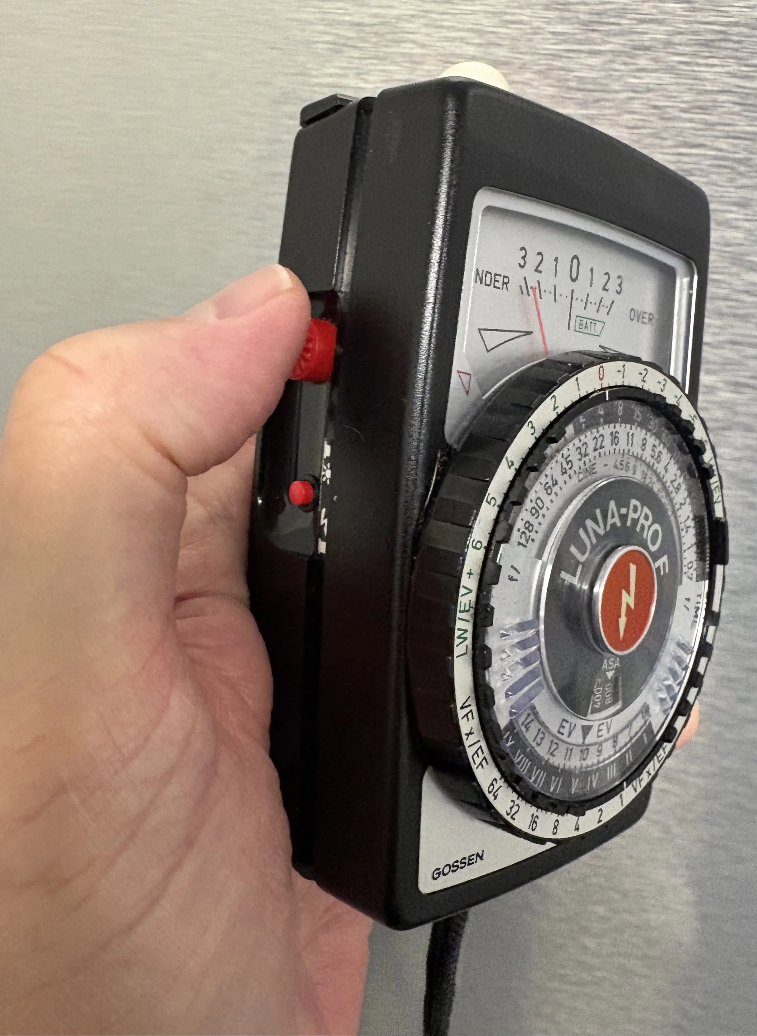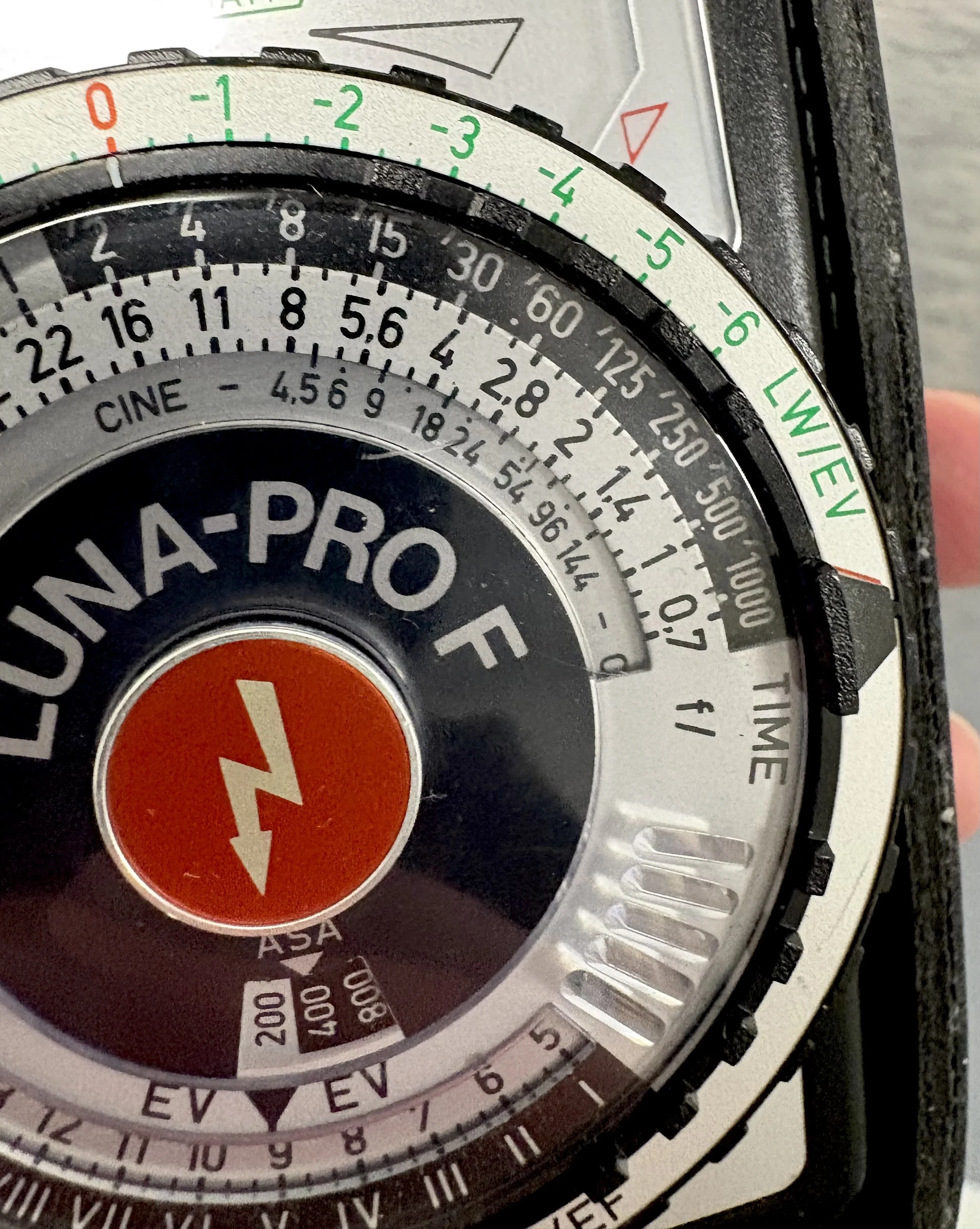 Gossen has been making light meters since the 1930s. My Luna Pro F is from the early 1980s. Most of the light meters available new today feature digital readouts. I’ve always been partial to the good old analog dial readouts. Problem is, some of the old analog light meters can be science projects to use and hard to read. I like simple…and that’s what attracted me to this meter. The Luna Pro F is powered by a 9-volt battery—the same kind you’ll find in a battery-powered smoke detector. Some of the earlier Gossen meters were powered by 1.35v Mercury batteries. The meter can take reflected, incident or flash readings.